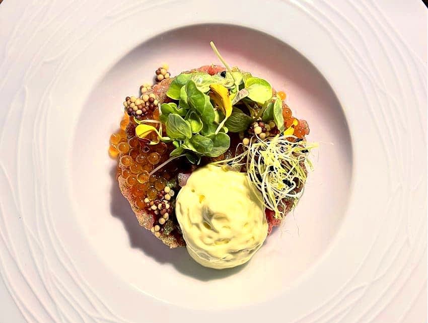 Throughout the tasting menu, starters and mains, Frantoio Pruneti’s eclectic range of olive oils complements each dish, from a Fruttato Equilibrato, which balances the beef tartar and trout caviar starter, to the Fruttato Intenso, which highlights the flavors of a local lamb cut.