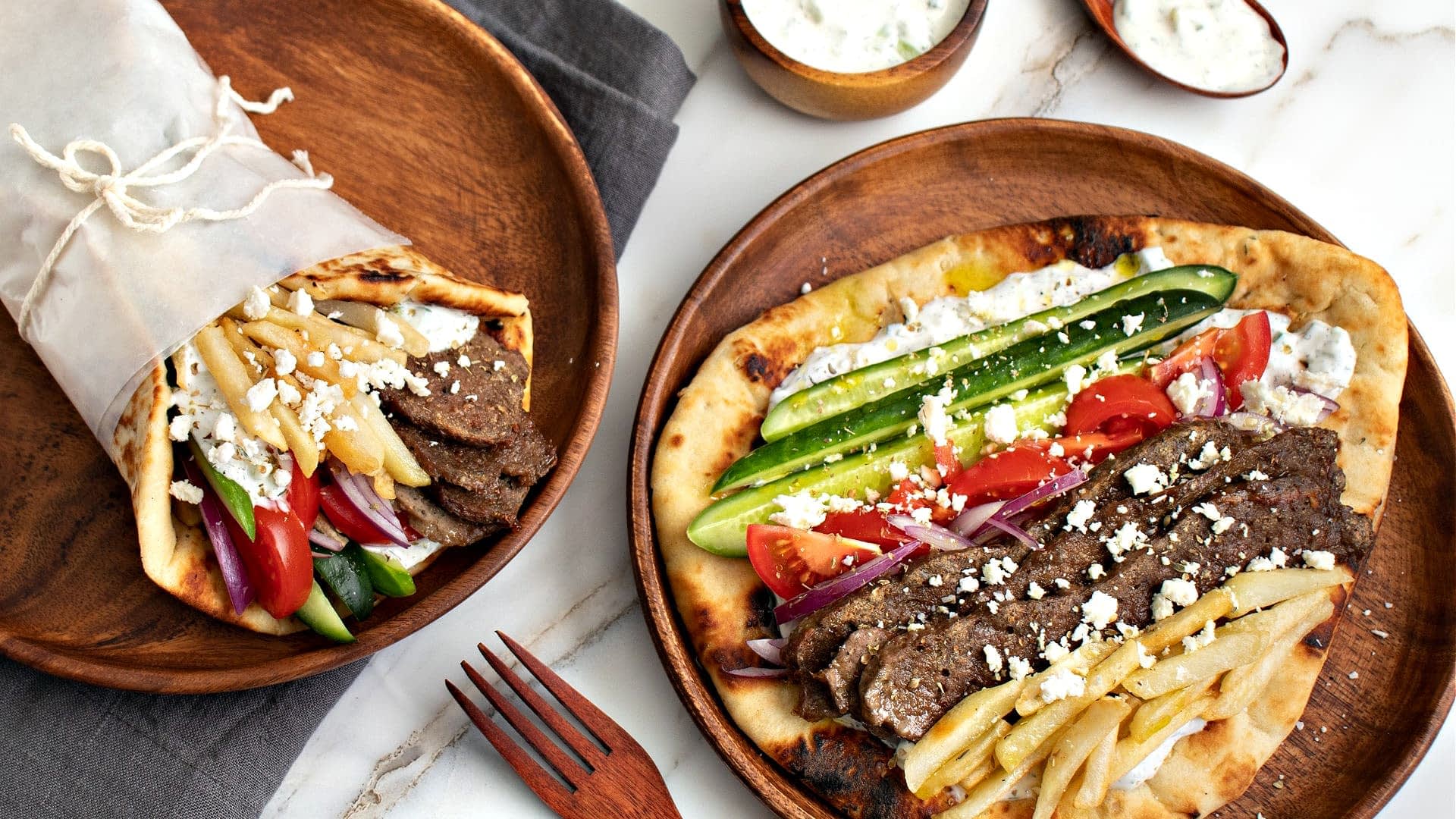 Bring the flavors of the Mediterranean and those iconic Greek sandwiches home to your kitchen. These homemade beef and lamb gyros are teaming with flavor; garlic, onions, and herbs. Extra virgin olive oil adds an impressive unctuous quality to the tzatziki, a tasty yogurt and cucumber condiment.