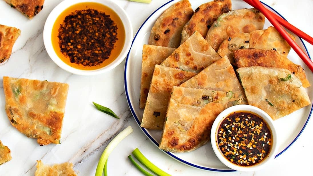 This recipe conÂtains two clasÂsic comÂpoÂnents that come together for one marÂvelous meal or appeÂtizer. The scalÂlion panÂcakes (a famous and traÂdiÂtional Chinese street food) are a crispy, flaky, and savory creÂation, easÂily recreÂated at home. The secÂond comÂpoÂnent is a fraÂgrant, chilli-infused olive oil, perÂfect for a spicy dip or drizÂzle over the panÂcakes. The oil is made by slowly heatÂing and steepÂing aroÂmatic ingreÂdiÂents (star anise, cinÂnaÂmon, cloves, Sichuan pepÂperÂcorns, garÂlic, and shalÂlots) with a modÂerÂately intense extra virÂgin olive oil. The pepÂpery punÂgency of most modÂerÂate EVOOs highÂlights these paired ingreÂdiÂents and enhances the crushed red pepÂper flakes (which are added after the steepÂing process).
